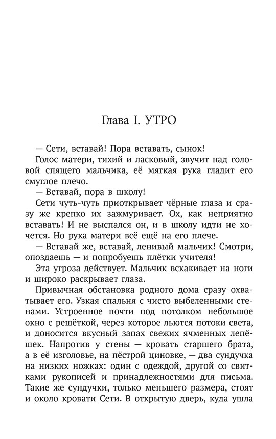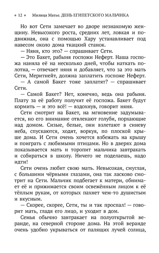 Повесть профессора-историка Милицы Матье перенесёт современного читателя во времена Древнего Египта и расскажет о жизни маленького мальчика Сети из состоятельной семьи. Много-много веков назад он жил в доме из глины, учился счёту и письму на черепках и папирусе, боялся опоздания в школу и слушал рассказы старших. Но главный урок ему преподнесут двое новых друзей, Мес и Маи, чьи семьи бедны, а труд непосилен. Сети узнает, насколько тяжело живётся рабам, солдатам и ремесленникам и как бесправны они перед богатыми фараонами и жрецами. Как же сделать так, чтобы все были счастливы? Эта книга научит ребёнка ценить человеческий труд, сопереживать ближнему, мыслить и рассуждать о недопустимости превосходства одних людей перед другими. Справедливость, честность, благородство и милосердие – качества, которые проявляет на страницах книги маленький герой, – необходимо воспитывать в ребёнке с самого раннего детства.