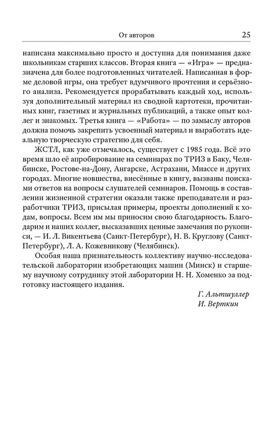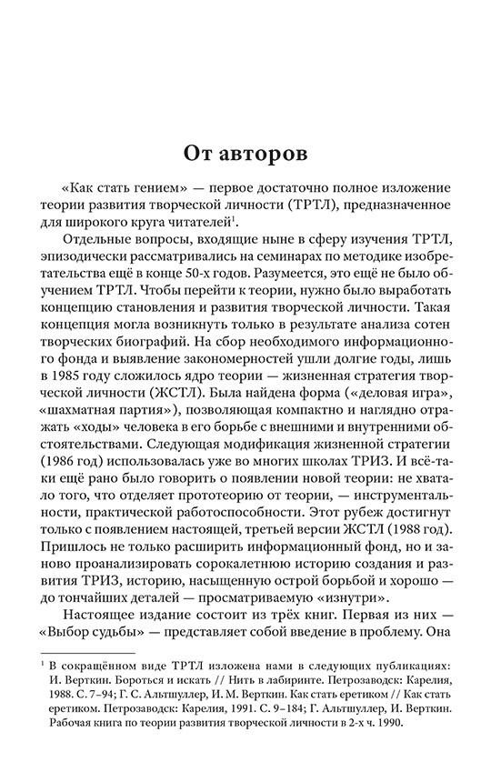 Эта книга в своё время произвела эффект разорвавшейся бомбы. Впервые творчество было рассмотрено как поддающаяся анализу и осознанному построению жизненная стратегия. Созданные авторами теория решения изобретательских задач (ТРИЗ) и жизненная стратегия творческой личности (ЖСТЛ) стали настоящим интеллектуальным прорывом, вызвали широкий резонанс и надолго опередили своё время. Аналогов этому подходу не существует и сегодня. Опираясь на анализ сотен биографий выдающихся учёных, изобретателей и мыслителей, авторы показывают, как формируется Достойная Цель, какие закономерности определяют путь творческой личности и почему решающими оказываются не случайные успехи, а последовательность продуманных шагов. Судьба человека становится напряжённой шахматной партией, где каждый ход имеет цену и последствия. Книга долгие годы оставалась библиографической редкостью. Настоящее издание выходит к столетию автора и возвращает читателю один из самых смелых и оригинальных трудов о природе творчества и человеческого выбора. Оно рекомендуется всем, кто стремится к осмысленному творческому пути независимо от профессии и возраста.