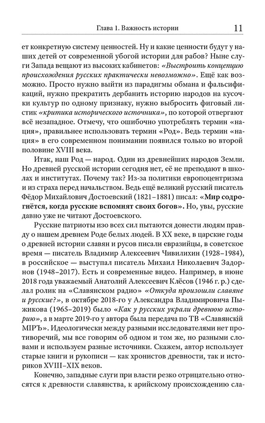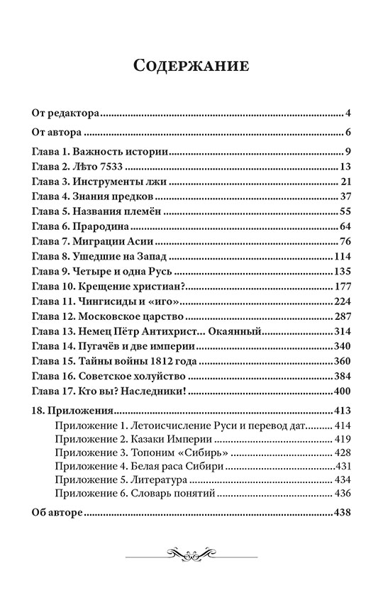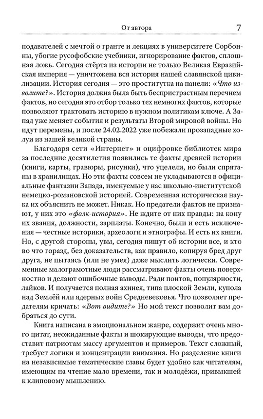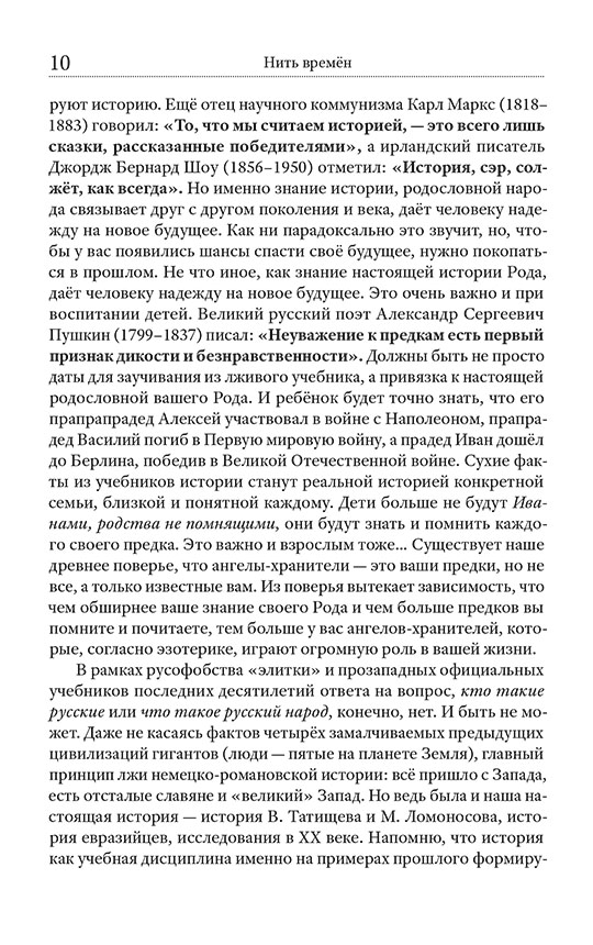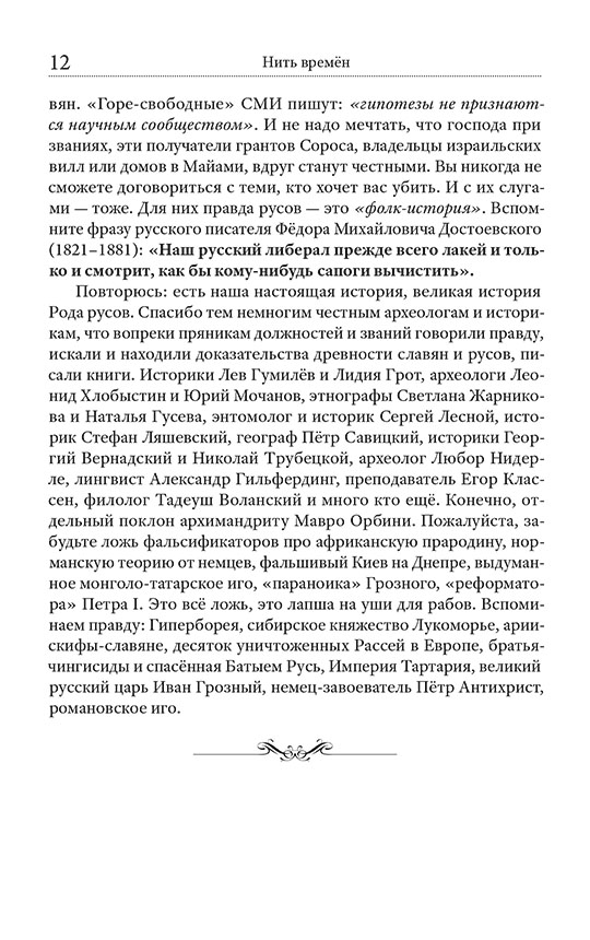 Перед вами пособие по настоящей древней истории Родов славян и русов. Конечно, оно сильно отличается от академической немецко-романовской версии, придуманной немцами в XVIII веке и навязываемой всем с детства. Всё строго научно: замалчиваемые факты и летописи, плюс беспощадная логика, плюс систематизация трудов десятков честных историков, археологов, этнографов XVIII–XX веков. Книга состоит из 17 глав — 17 разных тем, описывающих последние 12 тысяч лет нашего Рода. Русская нить времён — первое подобное пособие в стране. Ощутите себя русским человеком, частью большого Рода-семьи, великого русского народа, нашей эпохальной Руси. Гордитесь своей страной! И постарайтесь быть достойными своих великих предков.