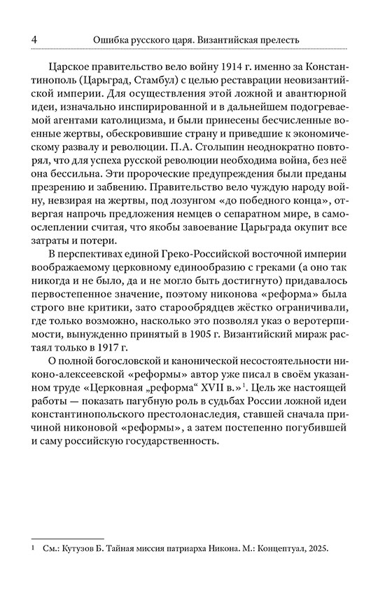 Что превратило благородную идею наследия Византии в духовную ловушку? Почему попытки установить контроль над Черноморскими проливами неизменно оборачивались трагическими последствиями для страны? Как «византийская прелесть» — фатальное обольщение угасшей империей — не только расколола Церковь, но и столетия спустя толкнула уже Российскую империю к гибели? Борис Кутузов анализирует, как мысль о константинопольском престоле переросла в навязчивую политическую мечту. На основе ранее рассекреченных документов показана взаимосвязь между церковными реформами XVII века, вступлением России в Первую мировую войну и революцией 1917 года. Книга затрагивает вечные вопросы национального самосознания, отношений Церкви и государства, а также роль идеологии в истории. Издание предназначено для широкого круга читателей, стремящихся к пониманию глубинных процессов, формирующих русскую историю, вопросов духовного наследия, политической власти и их взаимного влияния.