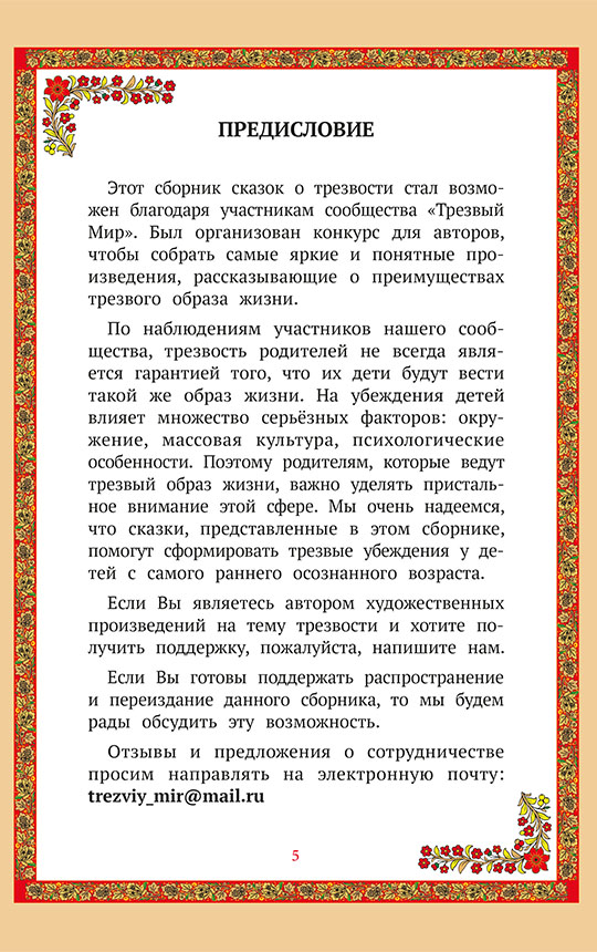 Есть важные вещи, о которых стоит знать с раннего детства, особенно когда хочется скорее почувствовать себя взрослым. Участники сообщества «Трезвый Мир» составили сборник добрых и поучительных сказок в прозе и стихах для детей о том, какими бедами грозит употребление алкоголя и табака. Ребята узнают, как Облако победило царство коварного Зеленого змия, честное стекло открыло людям правду об обманном зелье, а труд и сила воли помогли Волку побороть опасную зависимость. Эта книга научит ребёнка отвечать «нет» на уговоры сверстников, покажет всю опасность и гибельность нетрезвого образа жизни и поможет составить адекватную модель мира.