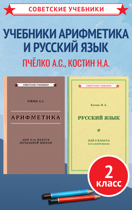 Этот комплект объединяет два классических советских учебника, которые дают второкласснику прочный фундамент в математике и русском языке. Учебник А.С. Пчёлко по арифметике ведёт ребёнка от счёта в пределах 20 к умножению и делению двузначных чисел, включает задачи на время, длину, вес и таблицу умножения. Материал подаётся последовательно и наглядно, формируя уверенные навыки устного и письменного счёта. Учебник Н.А. Костина по русскому языку сочетает грамматику, орфографию и развитие речи. Он учит правильно писать, строить предложения, разбирать части речи, пользоваться алфавитом. Примеры из классической литературы расширяют кругозор и формируют чувство языка. Преимущество комплекта — системность: ребёнок осваивает два ключевых предмета по советской методике — чёткой, логичной и без лишних отвлекающих элементов. Такой курс создаёт устойчивую базу для дальнейшего успешного обучения.