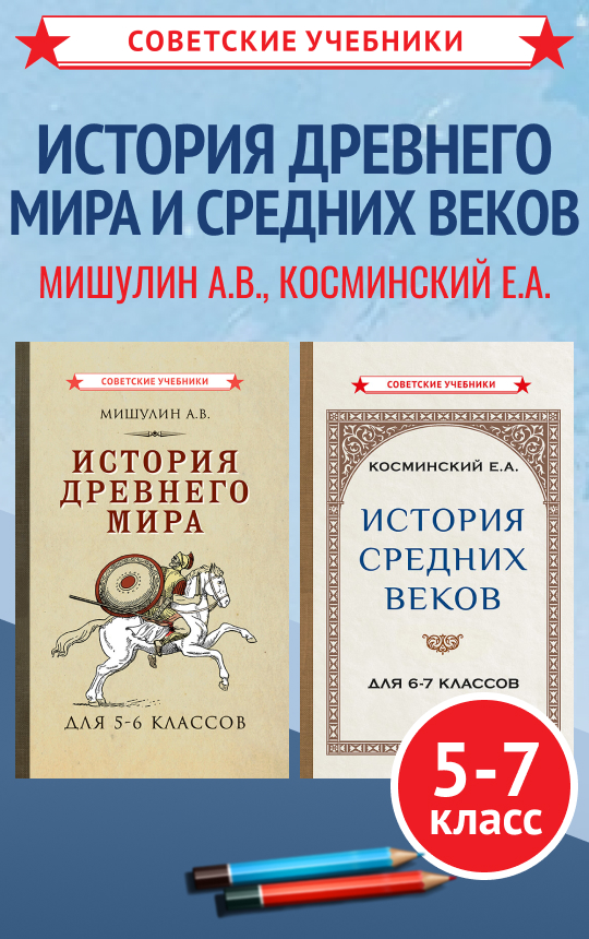 Наш комплект из двух советских учебников создан для глубокого и осмысленного изучения истории как дома, так и в школе. «История древнего мира» А. В. Мишулина рассказывает о развитии человечества от первобытности до падения Римской империи — через жизнь первобытных людей, расцвет Египта, подвиги Александра Македонского и завоевания Цезаря. «История средних веков» Е. А. Косминского показывает, как после падения Римской империи формировалась Европа — через феодализм, религию, ремёсла и войны. Учебники написаны доступным языком, помогая ребёнку понять исторические процессы, причины и последствия. Подходят для домашнего обучения и углублённой школьной подготовки.